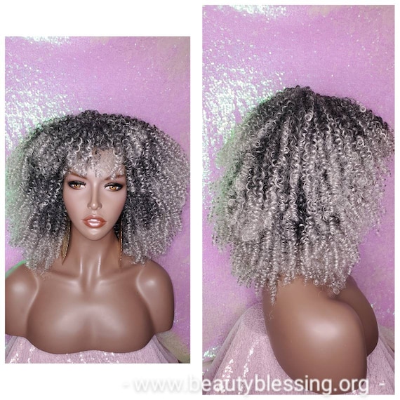 Wig 4c Curly Afro Kinky Twist Bangs Wig Afro Corkscrew Hair Wig Soft Natural Coily Ombre Gray Black Gray Salt Pepper Hair Wig Etsy Uk